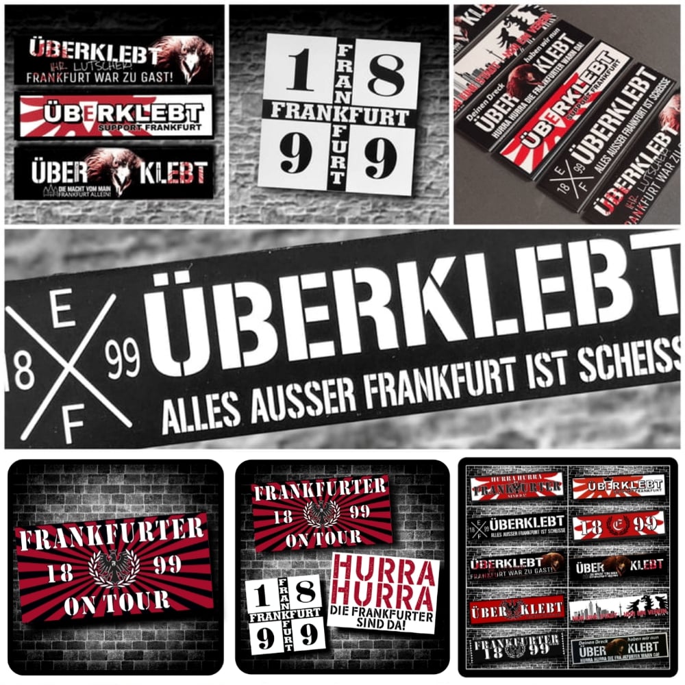 Verschiedene "ÜBERKLEBT", und in quadratisch "1899 FRANKFURT" (Bild oben Mitte), sowie weitere neue Sticker (siehe Bilder). Insges. 19 versch. Motive!